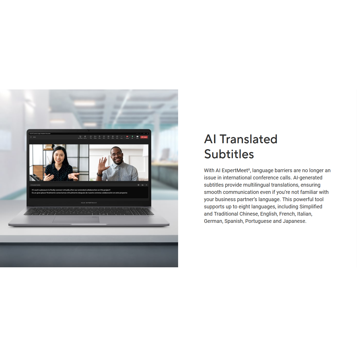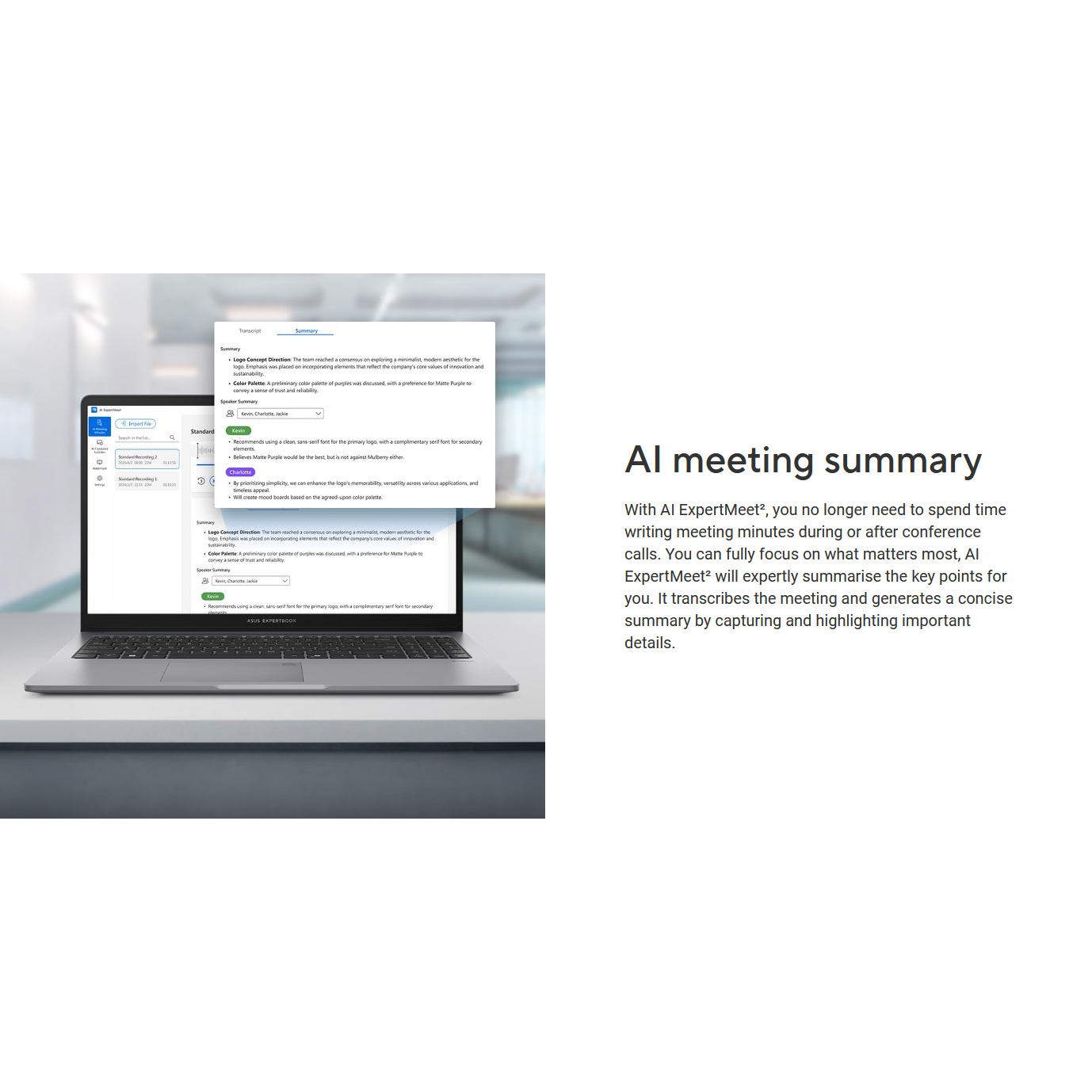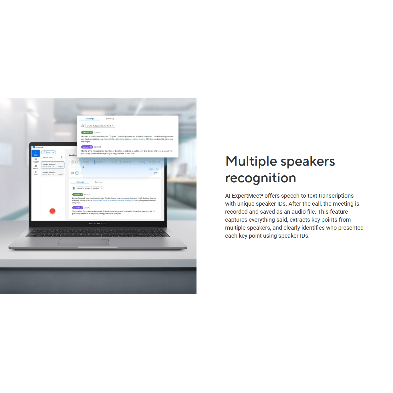 ASUS AI ExpertMeet is designed to bring you and your business partners closer by eliminating barriers to international conference calls. It offers seamless communication with AI translation and speaker ID functionality to help identify each speaker’s key discussion points. In addition, the AI Meeting Minutes feature assists in extracting the key points from your meetings.