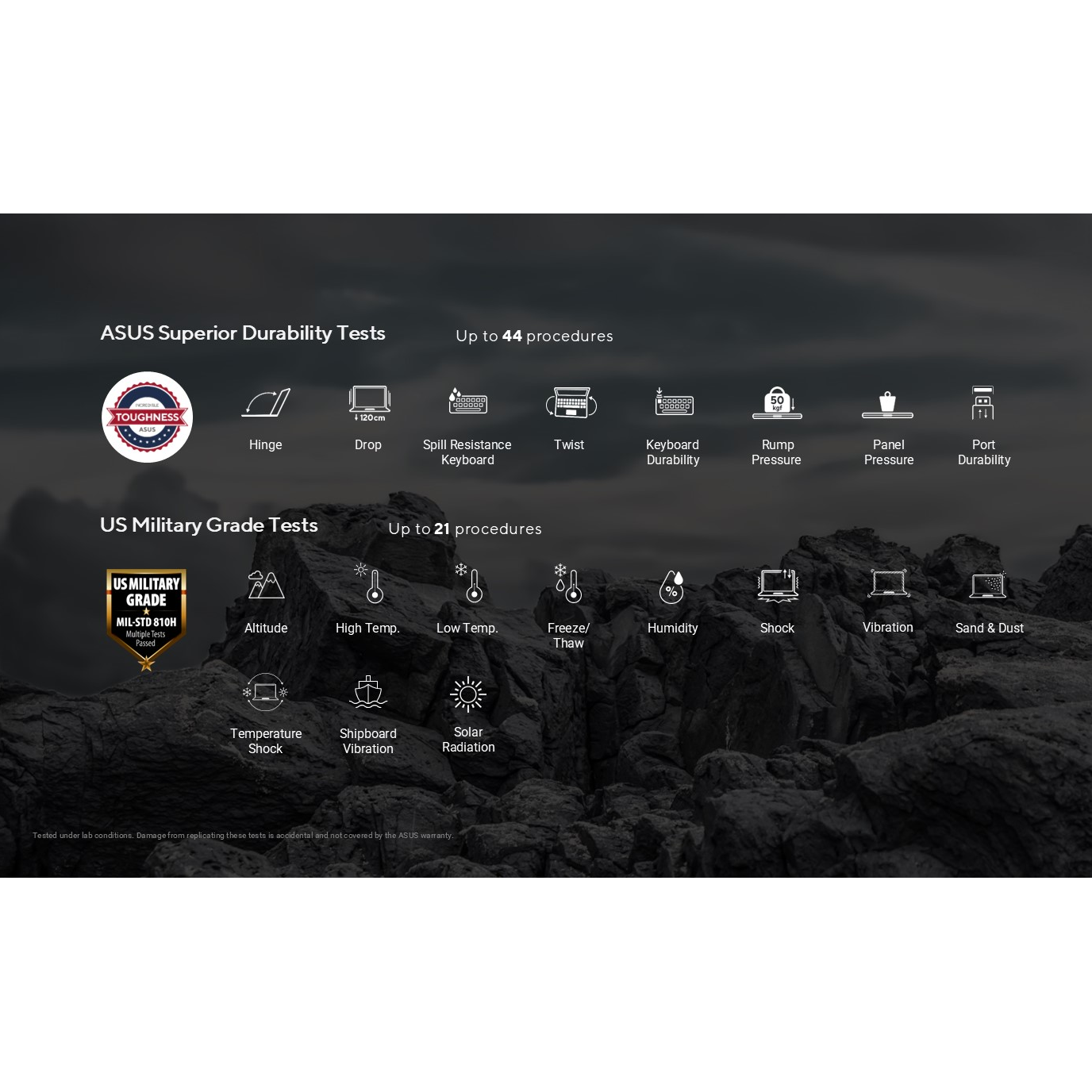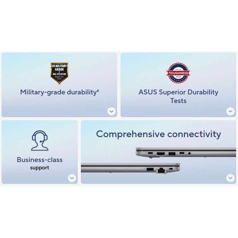 ASUS ExpertBook P1 is engineered with MIL-STD-810H military-grade4 strength to ensure resilience to environmental extremes, including wide temperature fluctuations, sudden shocks and jarring vibrations. It also undergoes the rigorous in-house ASUS Superior Durability Test regimen to simulate real-world use. Design refinements include durable hinges and strong ports crafted to withstand a lifetime of connections, plus reinforced chassis that shrug off everyday knocks and drops. These qualities deliver significant benefits to business, with exceptional reliability that minimises maintenance to maximise productivity — ready to get the job done on time, every time.