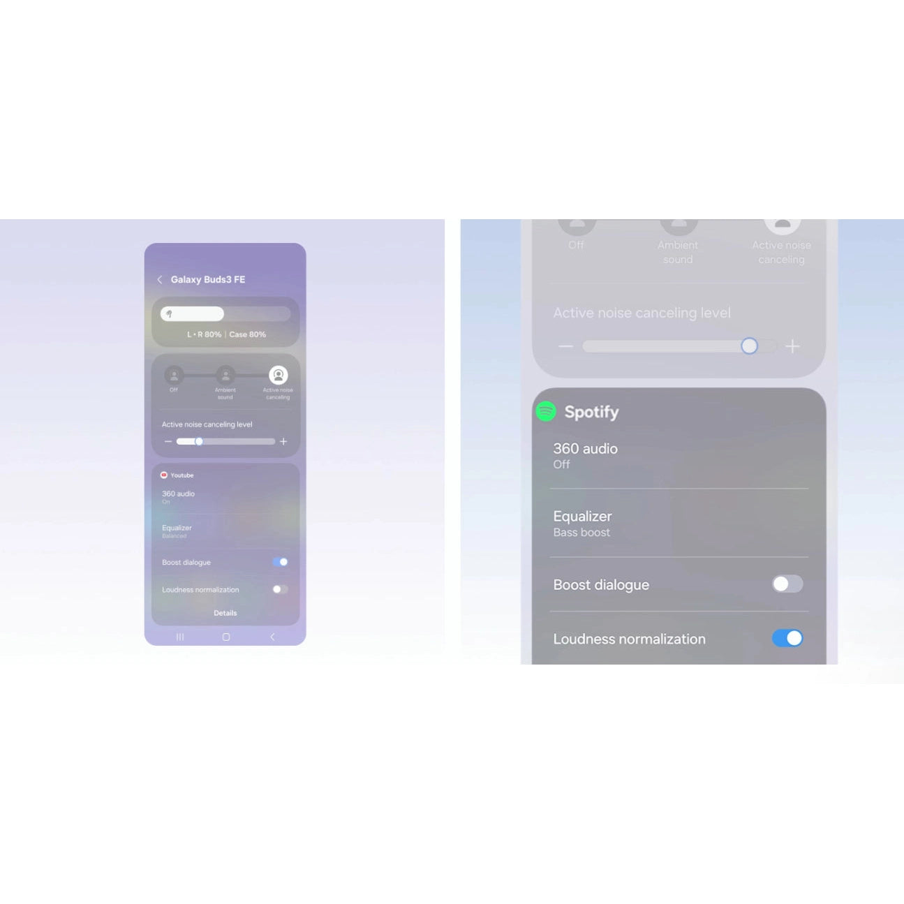 Fine-tune your sound while streaming videos or using other apps. Access key functions and Galaxy Buds settings directly from the Quick Panel, making it easy to adjust noise control and audio preferences the way you see fit - all while staying on the same app. From customising your equaliser settings on Spotify to enabling 360 Audio for YouTube, you can set and save sound settings for each app - keeping everything in tune with you.