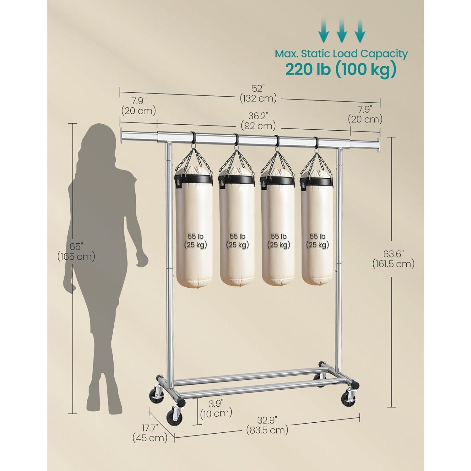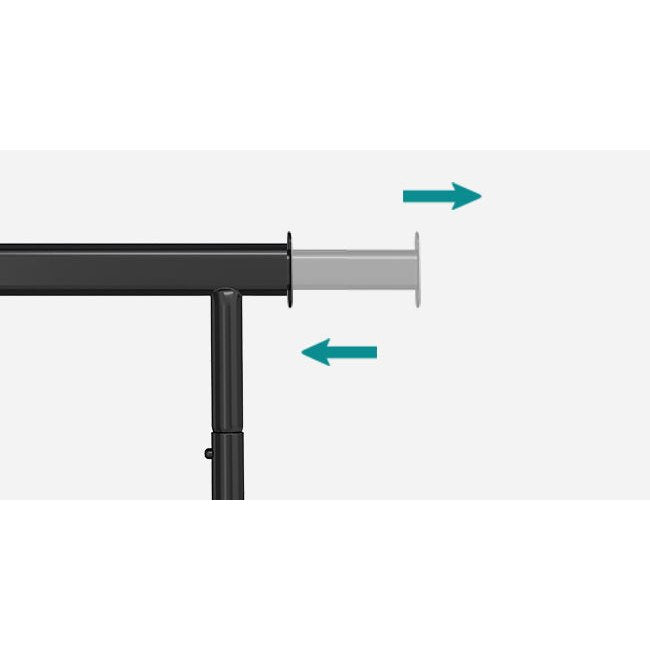 Each end of the top rail extends an additional 20 cm, offering extra hanging space (Top rail extends from 92 to 132 cm).